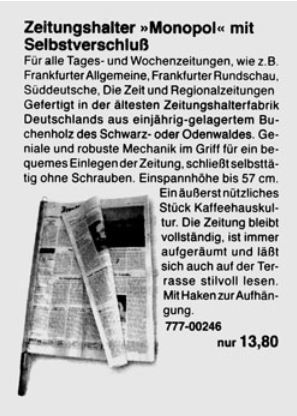 Tja, einer paßt für alle, und da sowieso in allen Zeitungen das gleiche steht, kann man das Gerät auch ruhig gleich »Monopol« nennen…